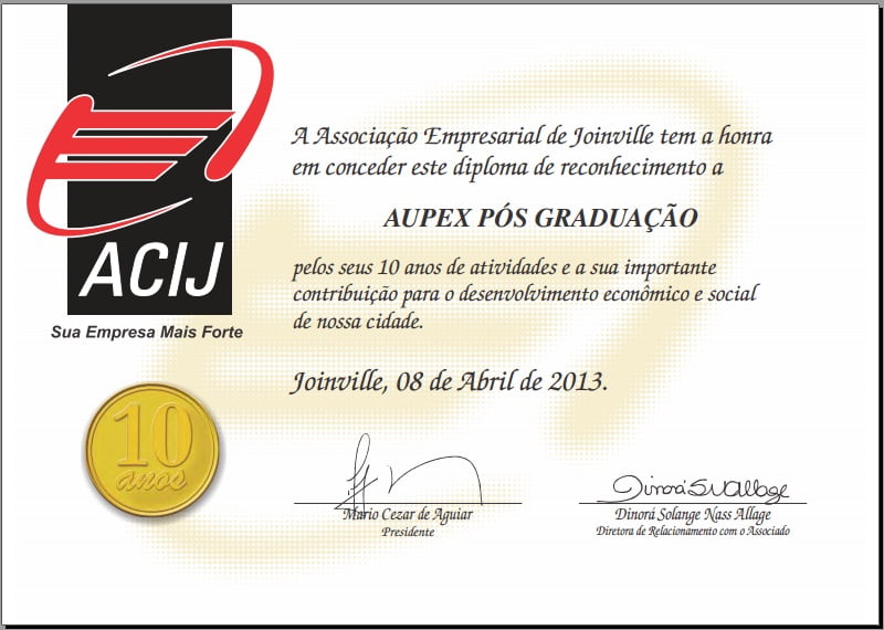 A Aupex – Ensino Superior completou neste ano 10 anos de credenciamento à Acij – Associação Comercial e Industrial de Joinville e foi uma das empresas joinvilenses homenageadas pela entidade. Segundo a diretora da Aupex, Carin Hoegen, o recebimento do certificado como empresa credenciada à Acij demonstra a seriedade da instituição de ensino superior e o comprometimento com Joinville, cidade matriz da Aupex. Itajaí e Bento Gonçalves (RS) são os municípios onde estão instaladas as filiais da instituição acadêmica.