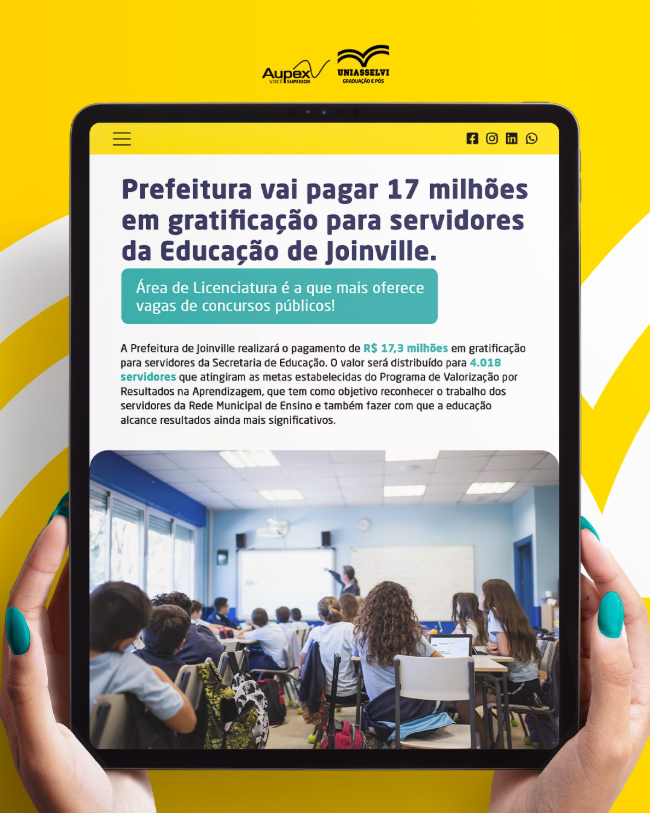 Entre os mais de quatro mil servidores da Educação de Joinville, centenas de concursados são egressos da Aupex Uniasselvi. Nossa instituição é a responsável pela certificação de Pedagogos e professores das áreas de Educação Física, Matemática, História, Geografia, Artes Visuais, Ciências Biológicas, Letras-Português, Letras-Inglês, Letras-Espanhol, Letras-Libras, Física, Química, Sociologia, Filosofia, Informática, Psicopedagogia, Dança e Teatro. A Aupex Uniasselvi é a instituição educacional de nível superior pioneira em EAD e semipresencial em Joinville e região.