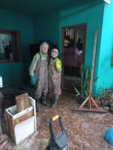 “Os helicópteros passavam levando pessoas nas redes, era um clima de guerra. Pensamos que íamos morrer afogados como também pensamos que poderíamos morrer de fome. Graças a Deus, os bombeiros entenderam nossas necessidades e trouxeram imediatamente garrafas de água mineral e marmitas. Por sorte, meus filhos s eorganizaram e vieram nos resgastar. Um deles veio de Imbituba acompanhado de um amigo com um barco sobre uma camionete, chegaram carregados de alimentos e água para nossa alegria. Nesse trajeto, achávamos que as estradas iam abrir, havia uma correnteza muito forte, foi uma tensão terrível o tempo todo, mas saímos ilesos, eu, meu esposo, dois gatos e dois cachorros”, relembra.